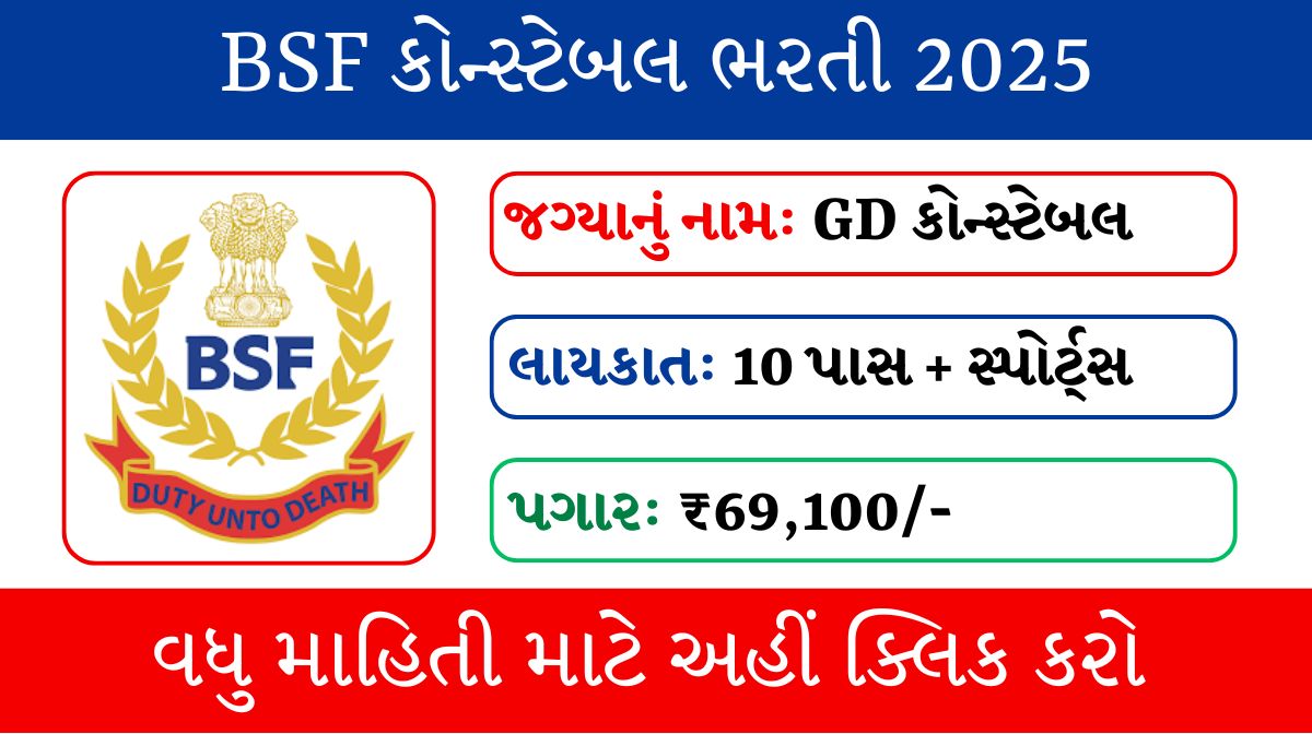 10 પાસ માટે GD કોન્સ્ટેબલ ભરતી, પગાર ₹69,100/- સુધી – BSF Constable GD Bharti 2025