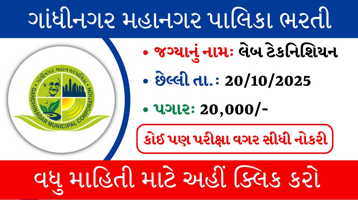 ગાંધીનગર મહાનગર પાલિકા દ્વારા લેબ ટેક્નિશિયન ભરતી, પગાર ₹20,000 – GMC Lab Technician Bharti 2025